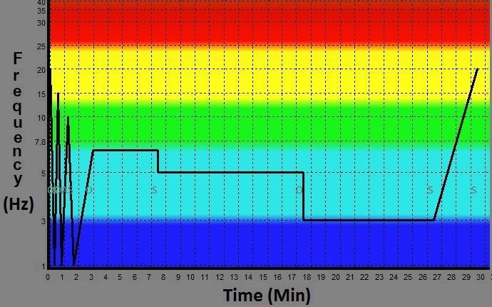This program cycles through the lower brain states at the beginning and then settles down into the theta range. The theta range offers high creativity as well as strong imagination response. Finally the program brings you back to the normal beta range of activity.
