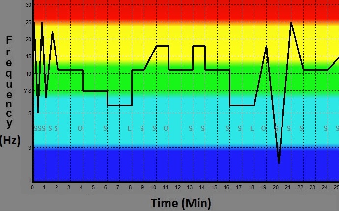 This program sweeps quickly through the alpha and beta ranges with gamma and theta range frequencies interspersed. This program is focused on eliciting pleasurable sensations and visualizations.